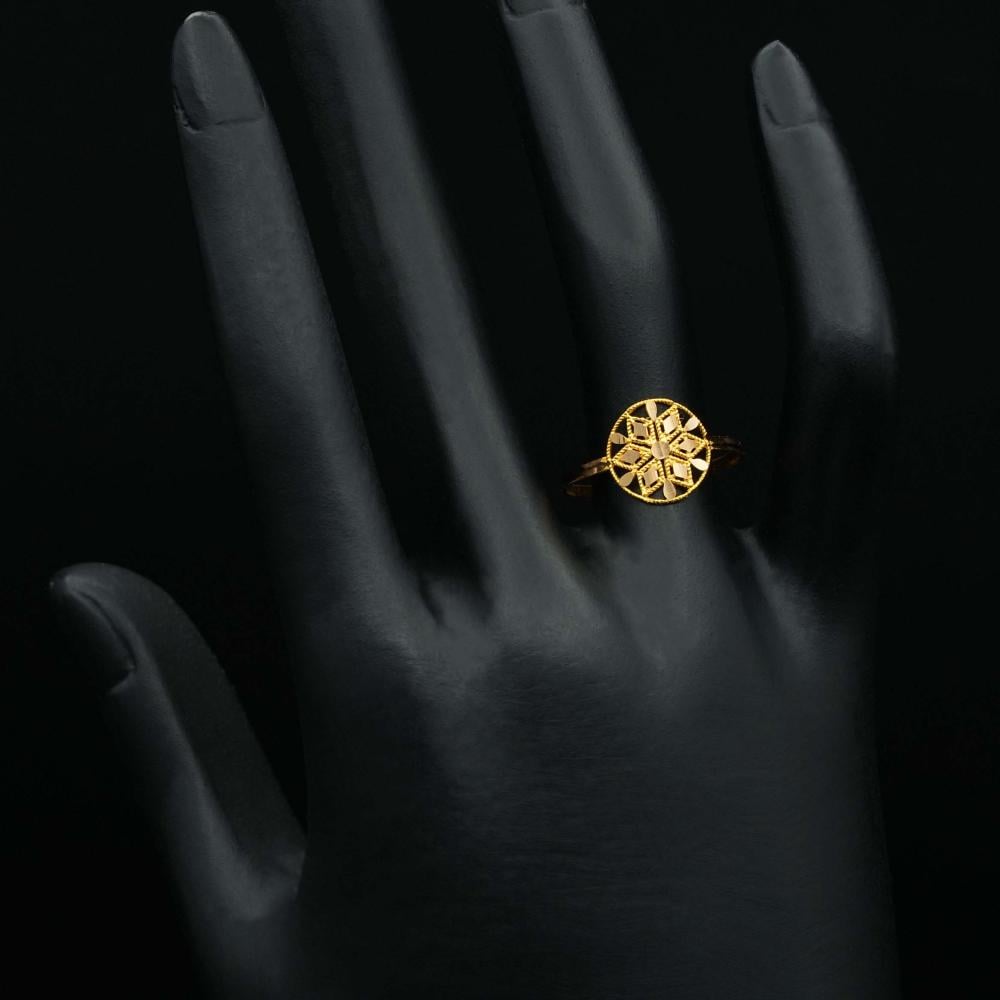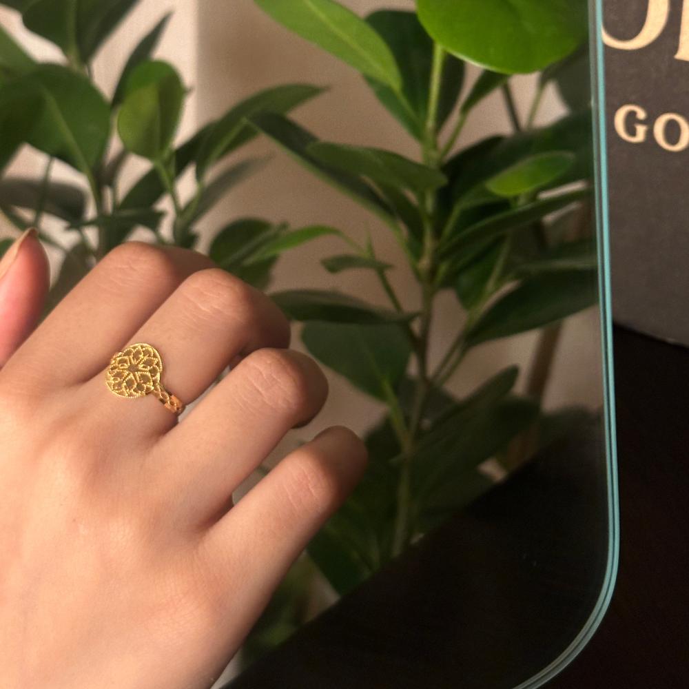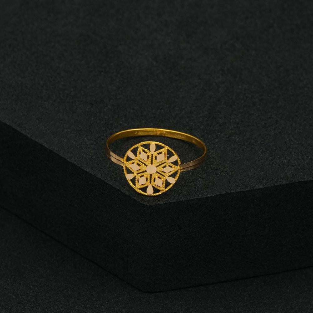 خاتم ذهب بتصميم كلاسيكي يحتضن بداخله زخارف على شكل زهرة، يعكس ذوقًا راقيًا، ويعتبر مميز للغاية في الإطلالات اليومية والمناسبات الخاصة بكل رقي وأناقة.